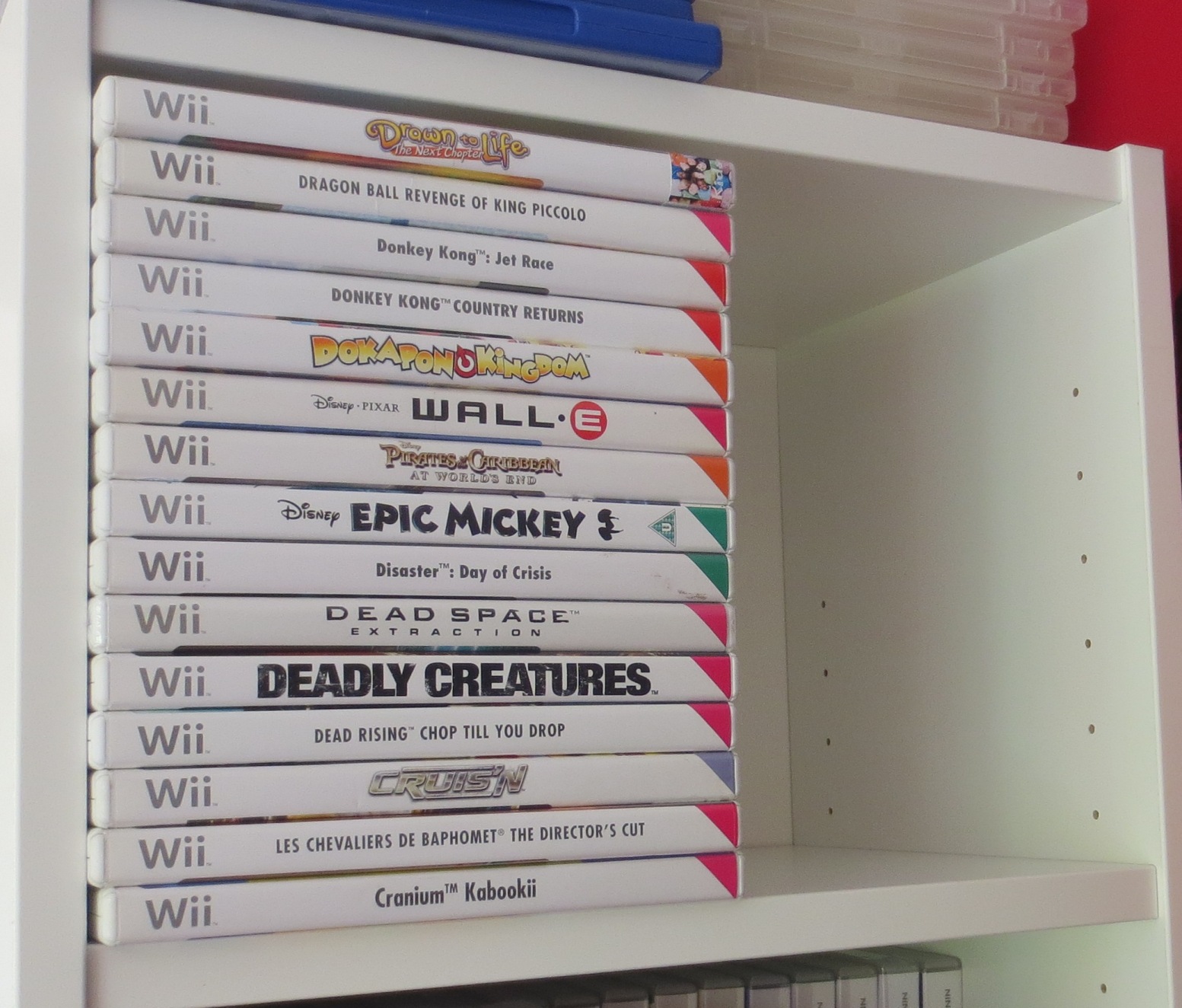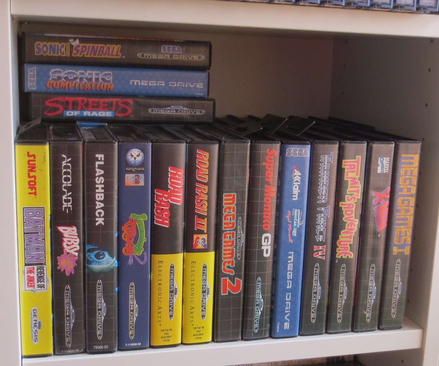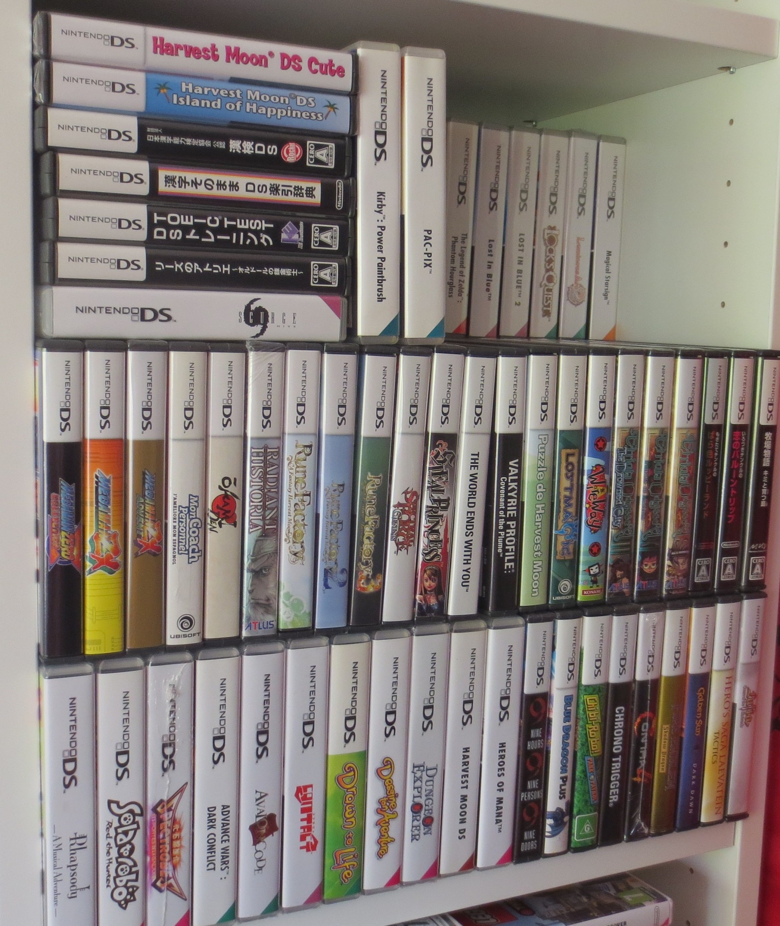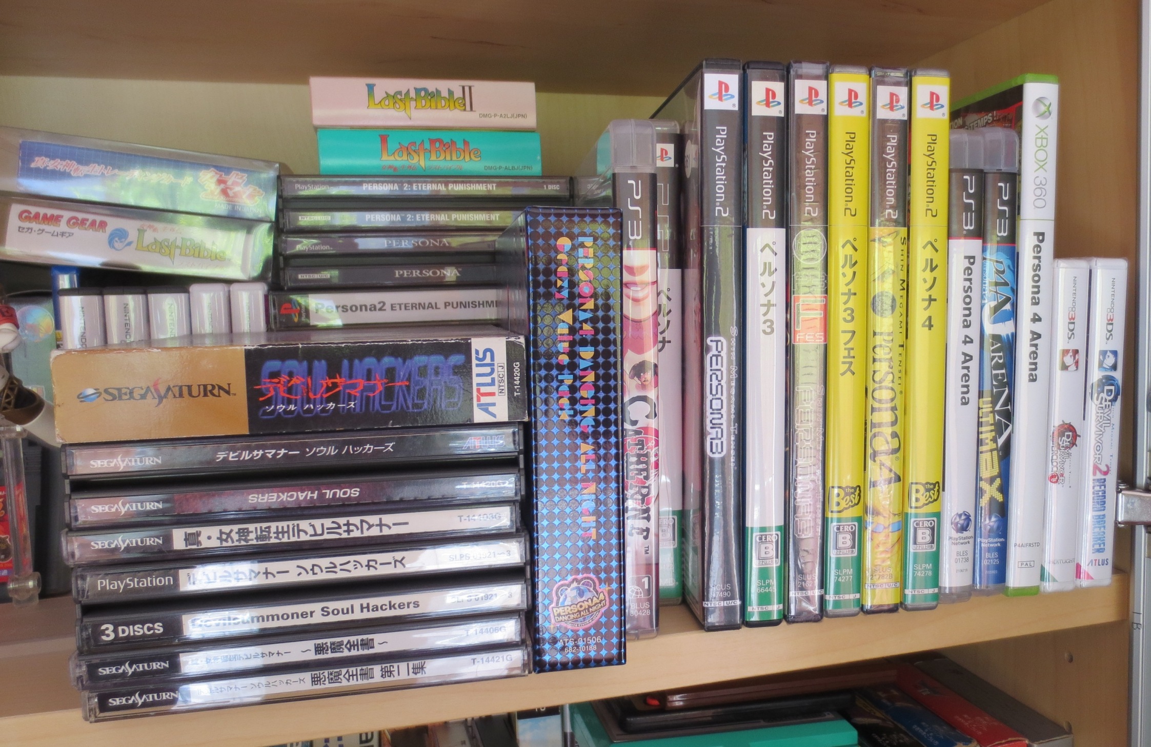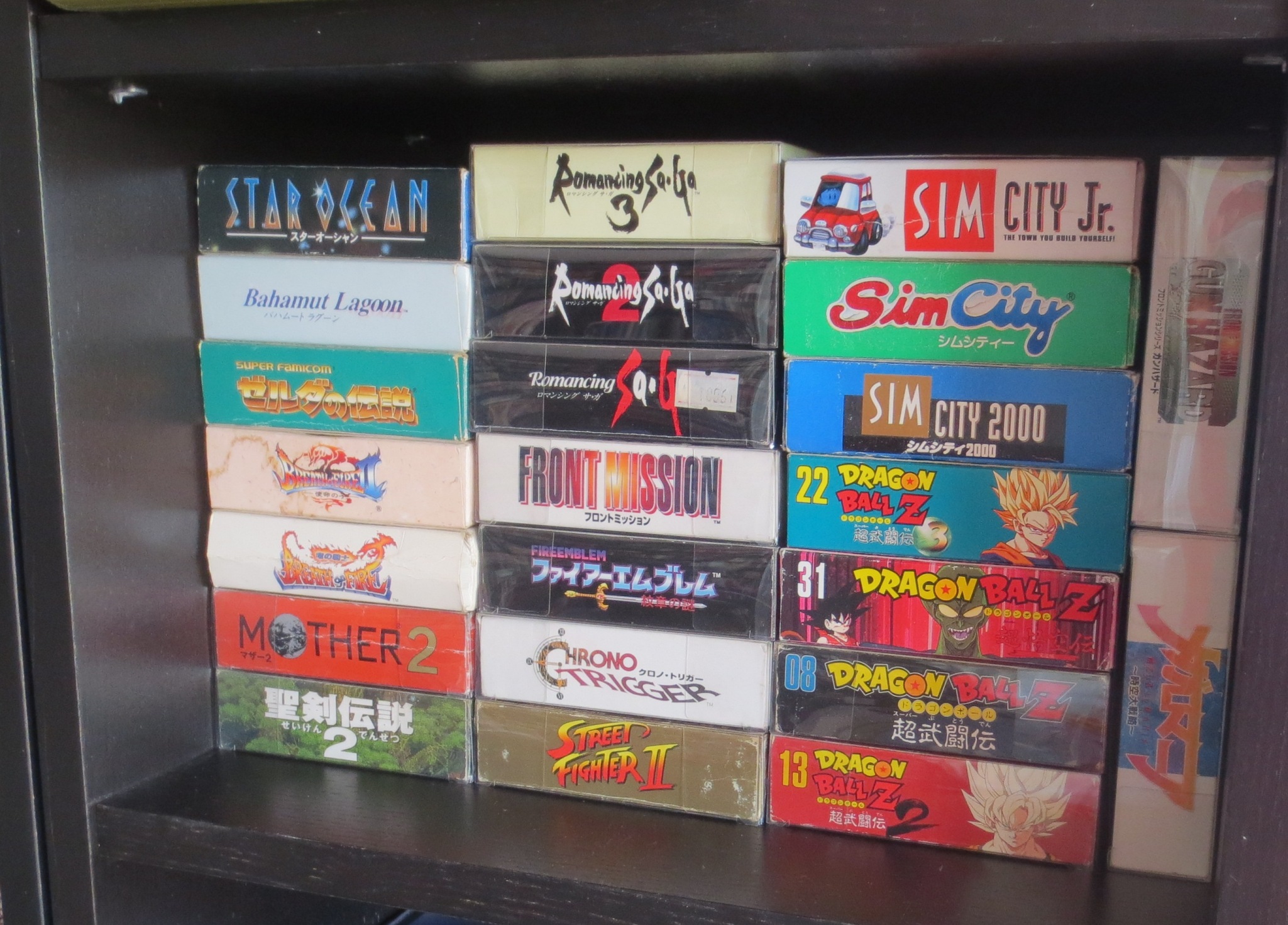 mais pas forcément les jeux les plus intéressants devant). Les jeux en loose sont également absents, et ça représente tout de même une grosse partie de la collection. Donc pas de jeux Nes, Snes, Famicom, MD ou N64 sur les photos. La flemme d'ouvrir les cartons... Un jour, je sortirai peut-être tous les jeux de leurs boîtes pour le fun... Mais quand je pense au temps que ça me prendrait, généralement, ça me démotive !
