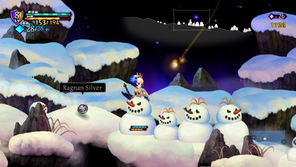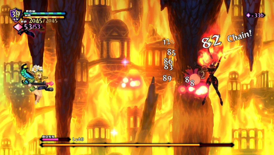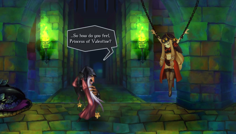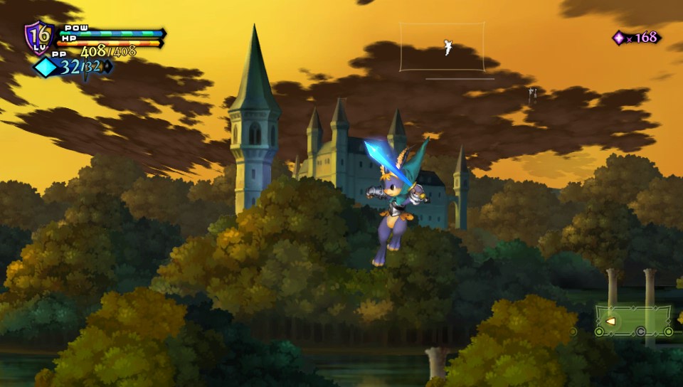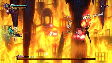 Alors, on traverse les mêmes donjons, certes, mais d'une part, l'ordre diffère et surtout l'agencement des salles n'est jamais le même. Il existe trois types de salles : carrées (où l'on trouve généralement des coffres), rectangulaires (que l'on traverse en ligne droite avec une porte à gauche, une porte à droite, voire en haut et en bas en fonction du sens) et en cercle (des arènes sans fin avec les portes au milieu). Et surtout, chaque personnage se joue différemment. Les attaques sont différentes (allonges plus ou moins longues, portées des attaques spéciales différentes), et dans le cas de Mercedes, la petite fée qui combat à l'aide d'une arbalète, le jeu devient un run and gun, voire un shoot'em up le temps d'un stage ou deux.